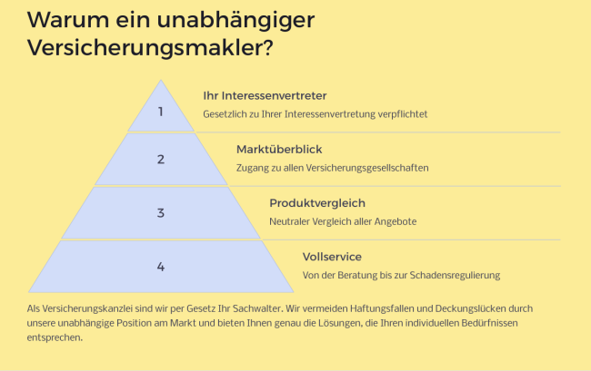 Wir beraten unsere Mandanten fach- und sachkundig zu Versicherungsprodukten, analysieren persönliche, wirtschaftliche und rechtliche Risiken unserer Kunden, geben Produktempfehlungen und übernehmen gerne auch die gesamte Vertragsverwaltung samt Schriftwechsel.
