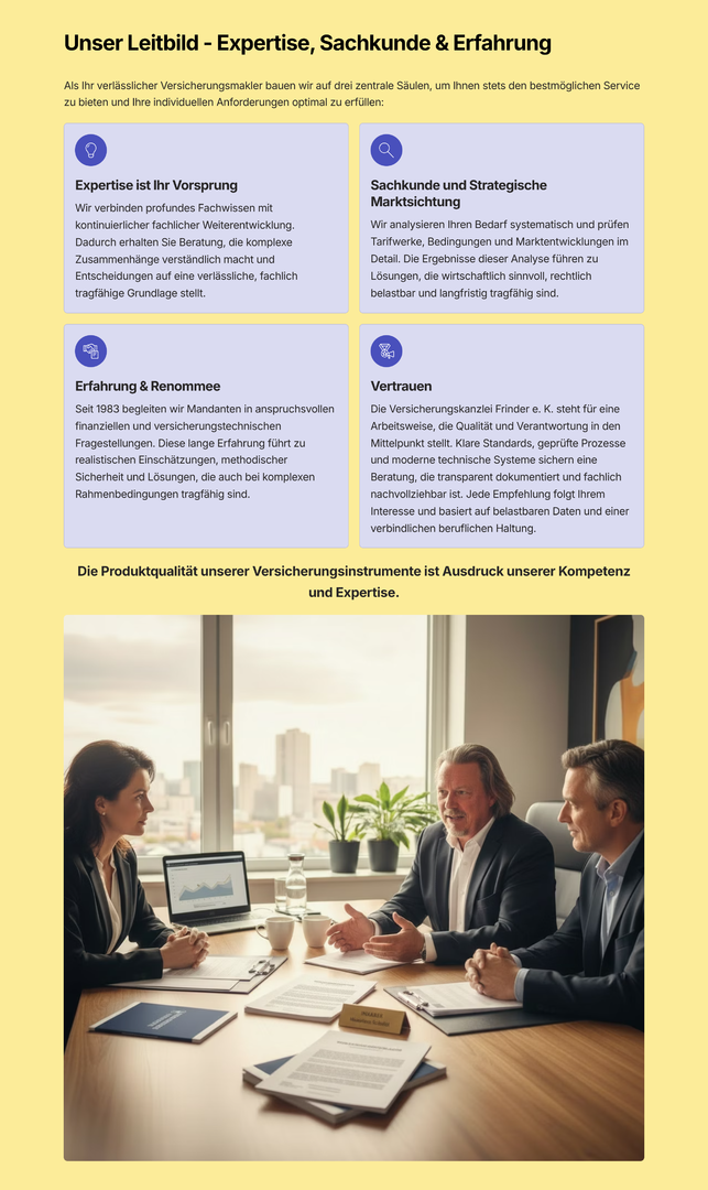 Ich vertrete Ihre Versicherungsinteressen mit der Haltung eines Sachwalters, der persönliche Verantwortung übernimmt, Ihre Lebens- & Sachrisiken mit Kompetenz ordnet und Ihre persönlichen Entscheidungen aufgrund einer solide geprüften Grundlage ermöglicht.